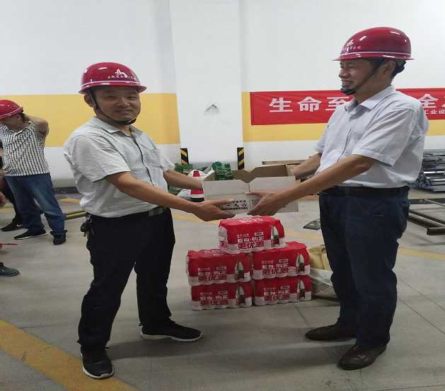 7月23日,第一分公司黨支部書記胡迎東、分管生產(chǎn)副經(jīng)理魯會(huì)、分管安全副經(jīng)理李多德、一分公司工會(huì)副主席鄭佳及相關(guān)部門負(fù)責(zé)人來(lái)到省行政中心提升改造項(xiàng)目部,為現(xiàn)場(chǎng)員工發(fā)放了茶葉、礦泉水、花露水等防暑降溫物品,把清涼送到了施工一線,把關(guān)懷送到員工心中!大家紛紛表示:雖然在屋頂露天施工酷熱難耐,但有分公司領(lǐng)導(dǎo)的關(guān)懷,一定能克服高溫環(huán)境帶來(lái)的困難,堅(jiān)守崗位,苦干實(shí)干,保質(zhì)保量地按時(shí)完成施工任務(wù)。