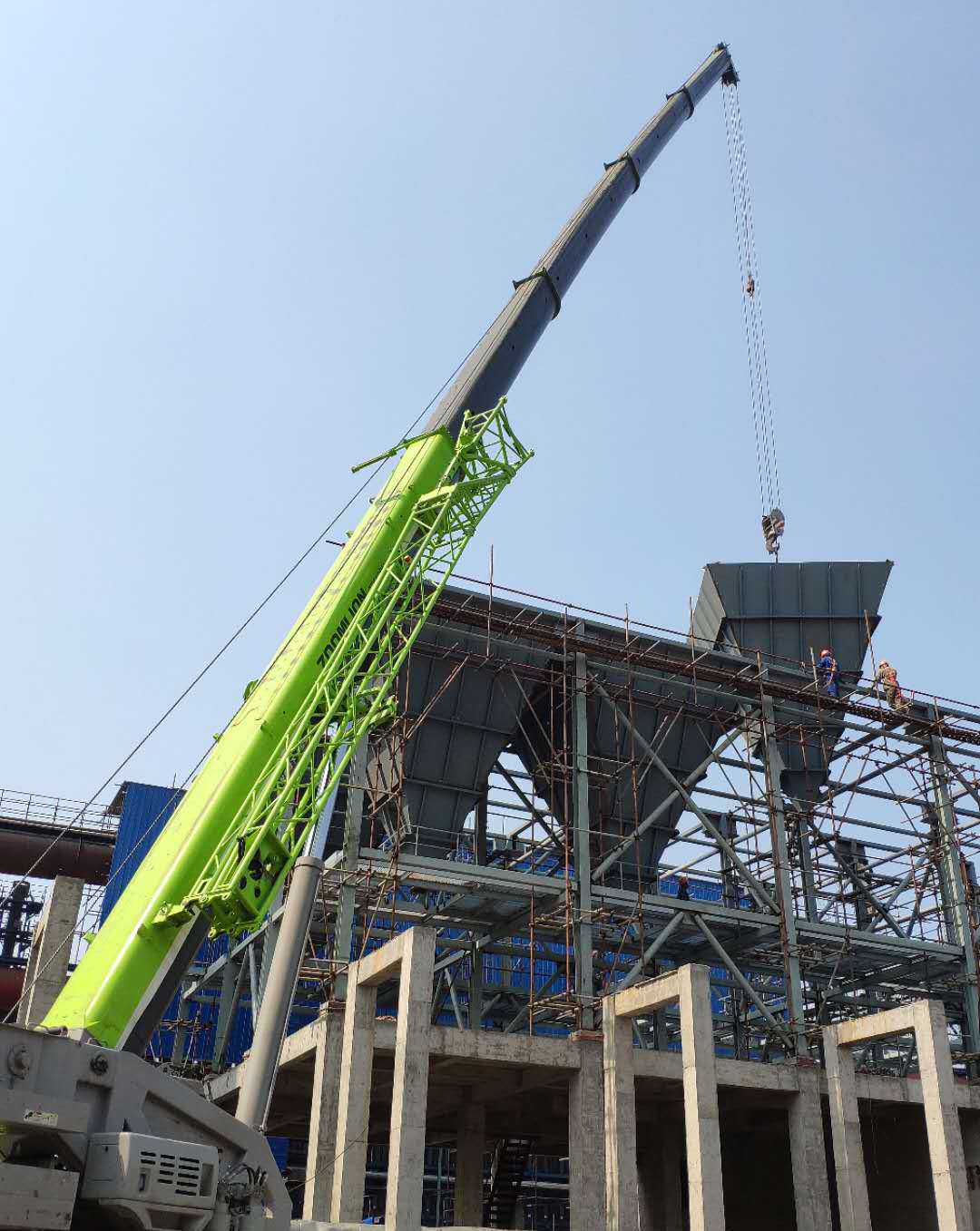 本次吊裝的反應(yīng)器灰斗部分總重量達(dá)56噸,吊裝作業(yè)存在場地狹小、與土建單位交叉作業(yè)多、吊重荷載大等諸多困難,吊裝任務(wù)異常艱巨。為此,項(xiàng)目部提前合理部署,多次優(yōu)化吊裝方案,按照方案要求采用額定荷載為100噸的汽車實(shí)施吊裝作業(yè)。項(xiàng)目部在設(shè)備吊裝前對全體“參戰(zhàn)”人員進(jìn)行了現(xiàn)場安全技術(shù)交底,明確施工工序、技術(shù)要點(diǎn)難點(diǎn)和安全風(fēng)險(xiǎn)點(diǎn),做到分工明確、責(zé)任到位,吊裝工作有條不紊地展開。在各方力量的通力配合下,經(jīng)過六個(gè)多小時(shí)的奮戰(zhàn),項(xiàng)目部終于完成了10臺灰斗以及現(xiàn)場輔助設(shè)備的吊裝任務(wù)。