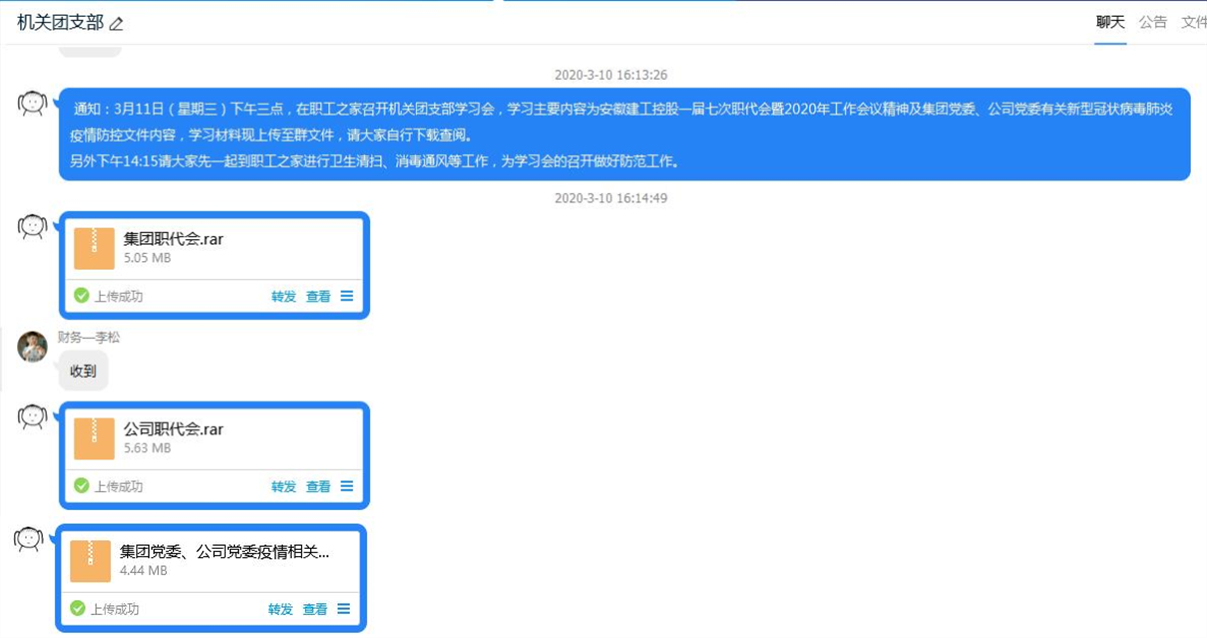 本次理論學(xué)習(xí)會為了縮短會議時(shí)間,采取集中學(xué)習(xí)與個(gè)人學(xué)習(xí)相結(jié)合的方式。會前已將學(xué)習(xí)材料分享至群文件,供大家自學(xué)查閱。會上全體團(tuán)員集中學(xué)習(xí)了安徽建工控股一屆七次職代會精神、安徽安裝第十六屆七次職代會精神及《安徽安裝公司關(guān)于切實(shí)做好復(fù)工復(fù)產(chǎn)前疫情防控工作的通知》文件精神。