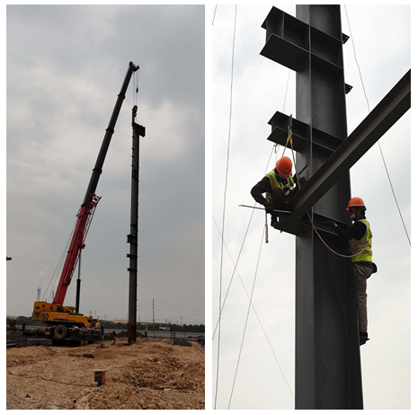 伴隨著隆隆的吊車(chē)轟鳴聲,閃爍的電焊火花,縱橫交錯(cuò)的鋼構(gòu)架拼裝,一道道工序正在有條不紊的進(jìn)行著……這是走進(jìn)蕪湖宇培年產(chǎn)50萬(wàn)方建筑工業(yè)化構(gòu)件生產(chǎn)基地項(xiàng)目鋼結(jié)構(gòu)工程,看到的一片繁忙施工景象。因受疫情的影響,項(xiàng)目部2020年3月5日接到總包的復(fù)工復(fù)產(chǎn)通知,3月6日立即組織召開(kāi)復(fù)工會(huì)議,全面部署“防疫”舉措和生產(chǎn)任務(wù)。在做好施工必備的人、材、機(jī)進(jìn)場(chǎng)和安全教育及技術(shù)交底后,3月11日,當(dāng)?shù)谝桓?7米高的廠房跨立柱穩(wěn)穩(wěn)地吊裝成功后,項(xiàng)目部全面啟動(dòng),按下?lián)尮ぁ翱爝M(jìn)鍵”。