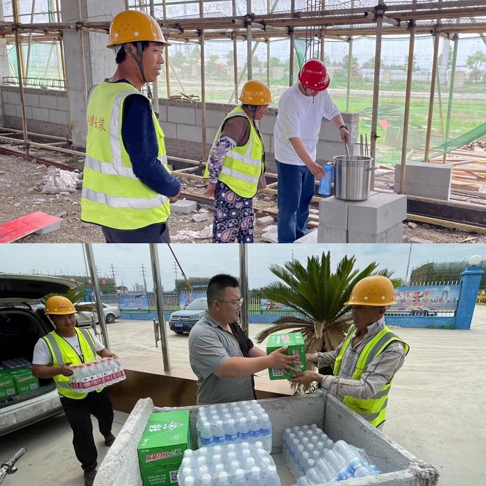 為應(yīng)對高溫天氣安全施工,項目部提前制定防暑降溫工作方案,管理人員在現(xiàn)場設(shè)置納涼棚為工人提供休息場地,針對高溫天氣,采取干兩頭避中間,利用夜晚加班等方式全力推進施工進度。同時項目后勤保障人員在高溫時段提供礦泉水、綠茶等清涼解暑飲品,并持續(xù)每天熬制綠豆湯分發(fā)至各班組,為每位員工帶來絲絲清涼。項目安全科備足人丹、藿香正氣液、十滴水、清涼油、風油精等防暑降溫用品,做好高溫天氣施工保障,確保施工安全、高效、有序推進。